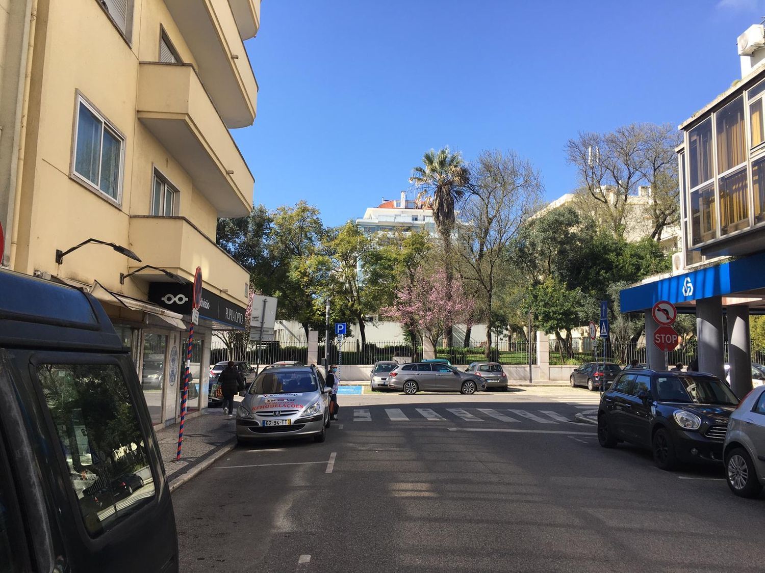 Zona calma com muito comércio, perto da estação de comboios de Algés.