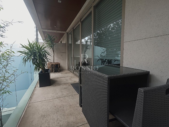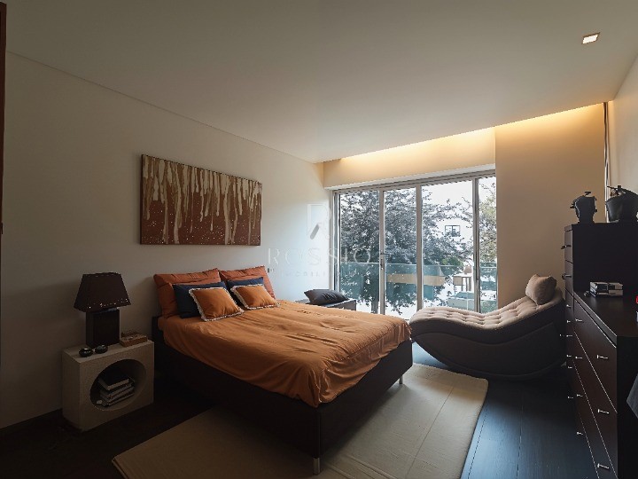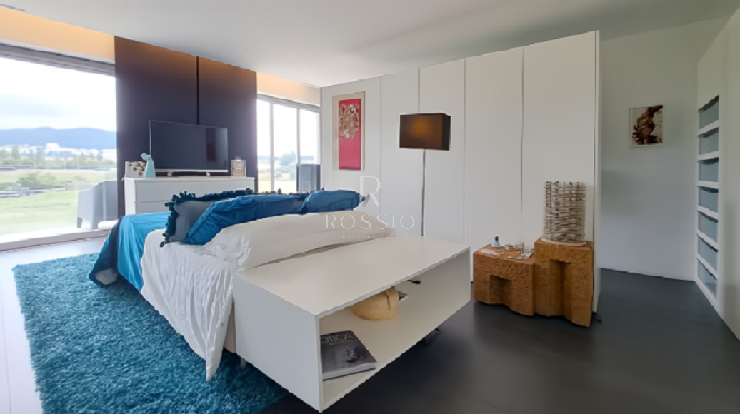 A suite principal inclui um closet e uma varanda com vistas sobre o rio.