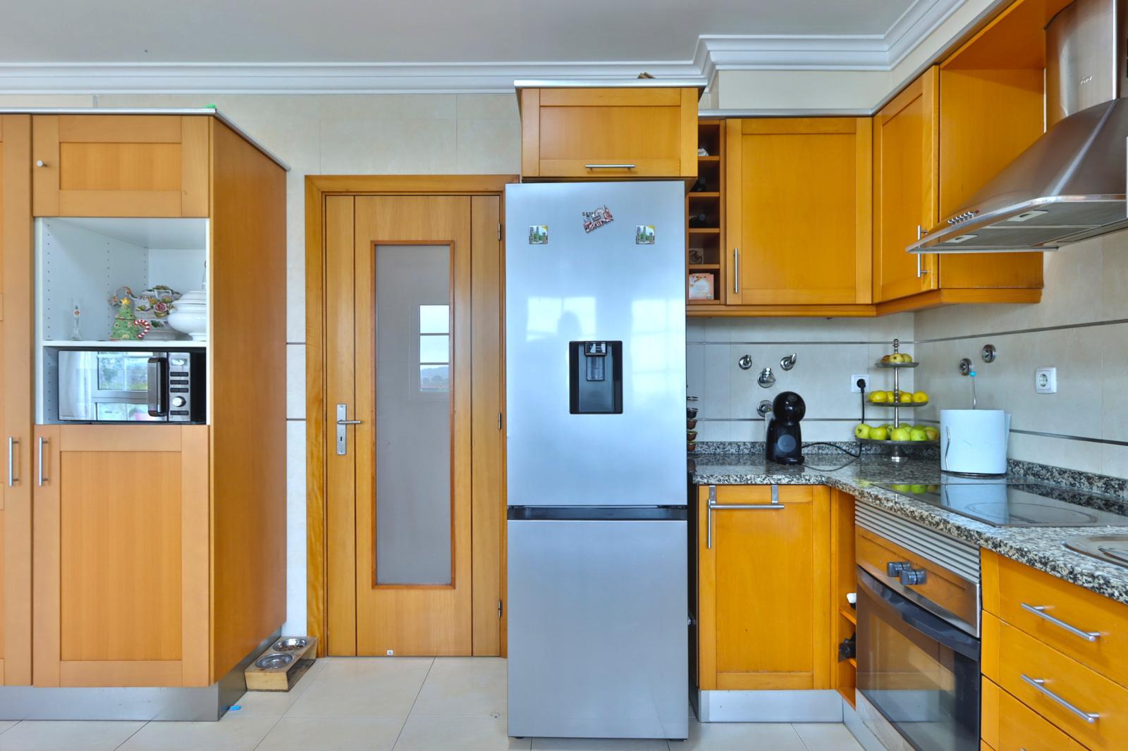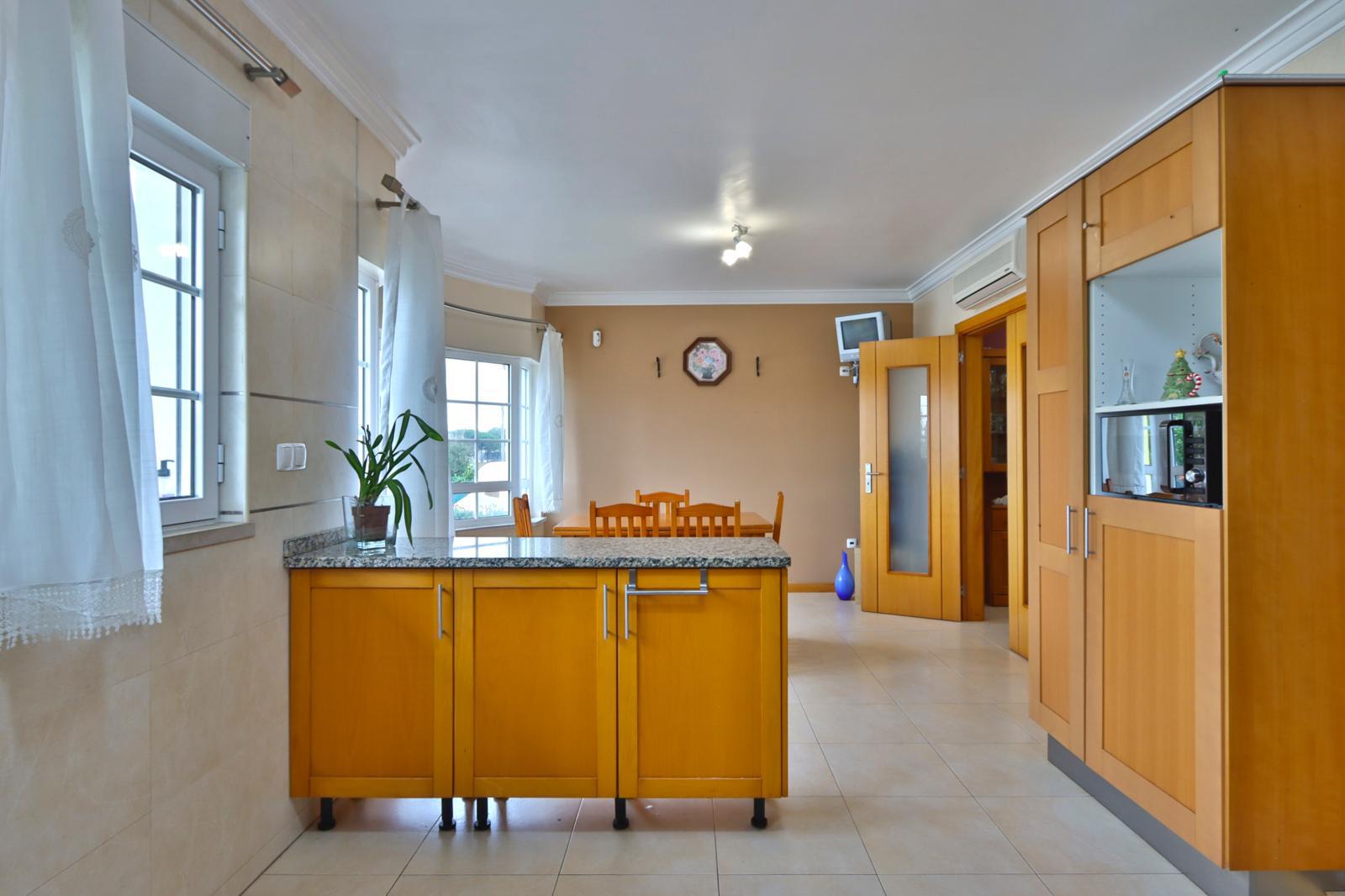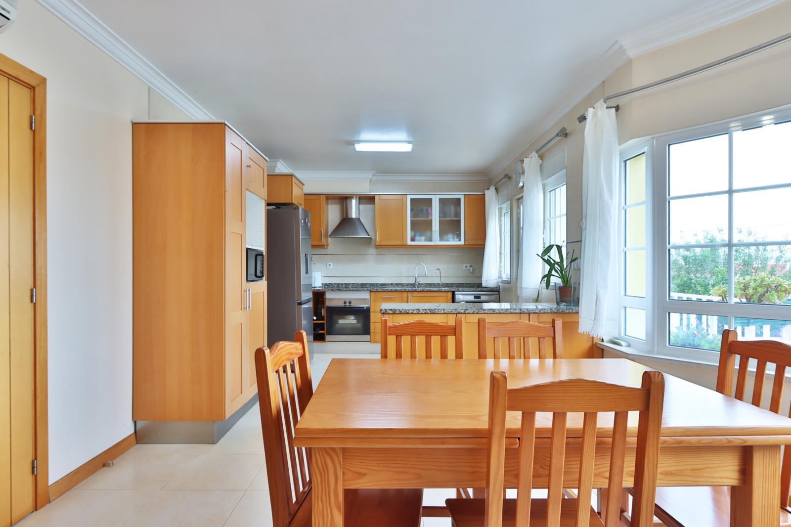 • 1 cozinha que ficará toda equipada e que possui um espaço extra onde se pode ter uma mesa de refeições ou para tomar o pequeno-almoço a contemplar uma vista linda e desafogada. Ainda na cozinha, há uma varanda que dá acesso ao piso inferior.