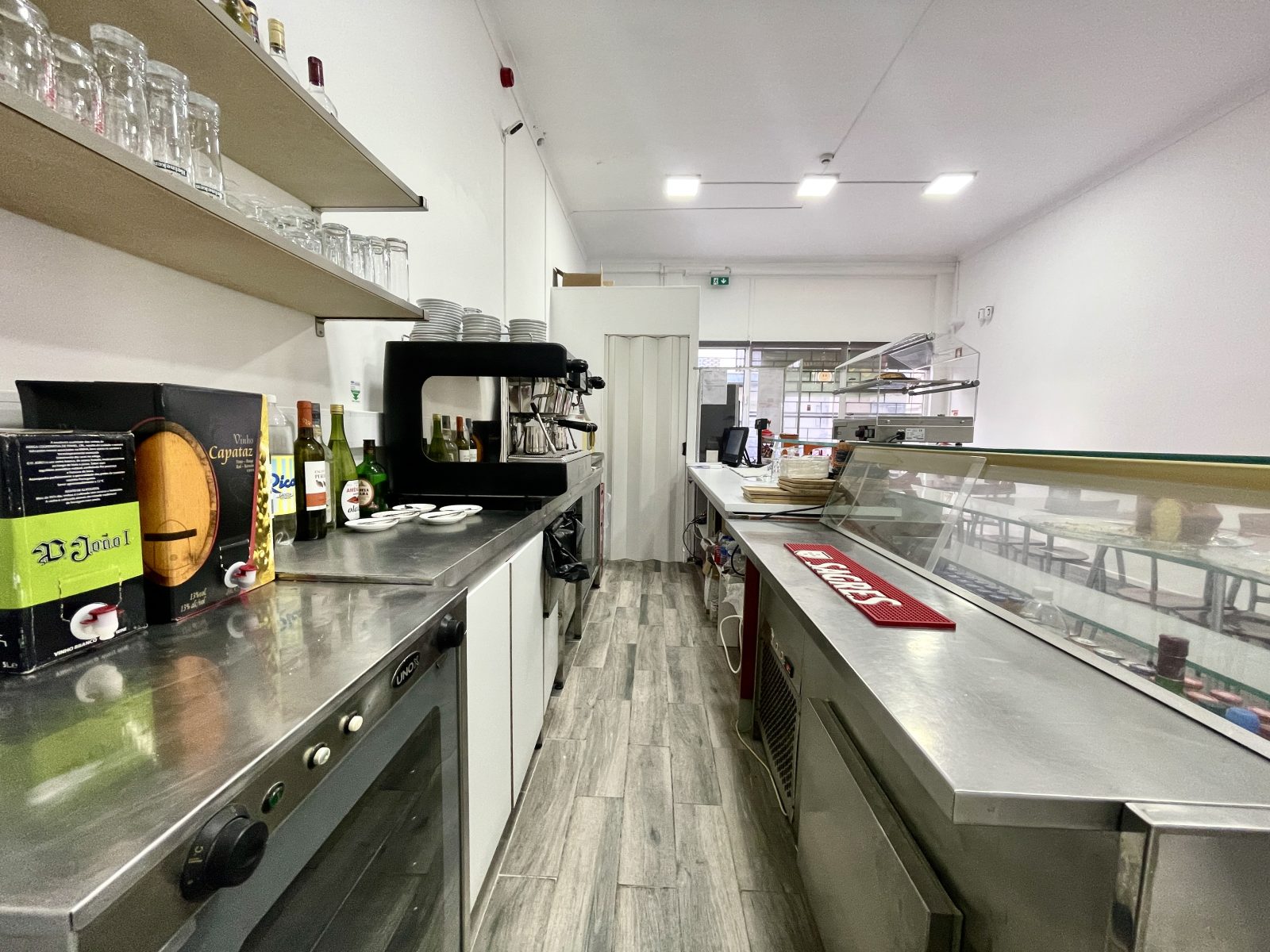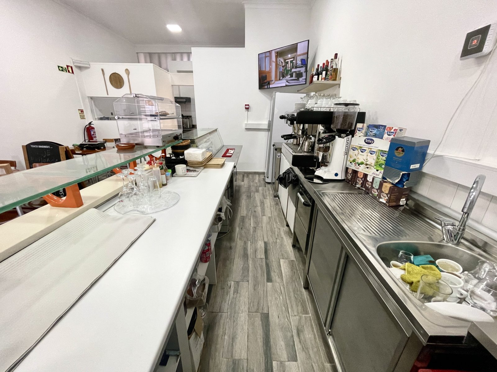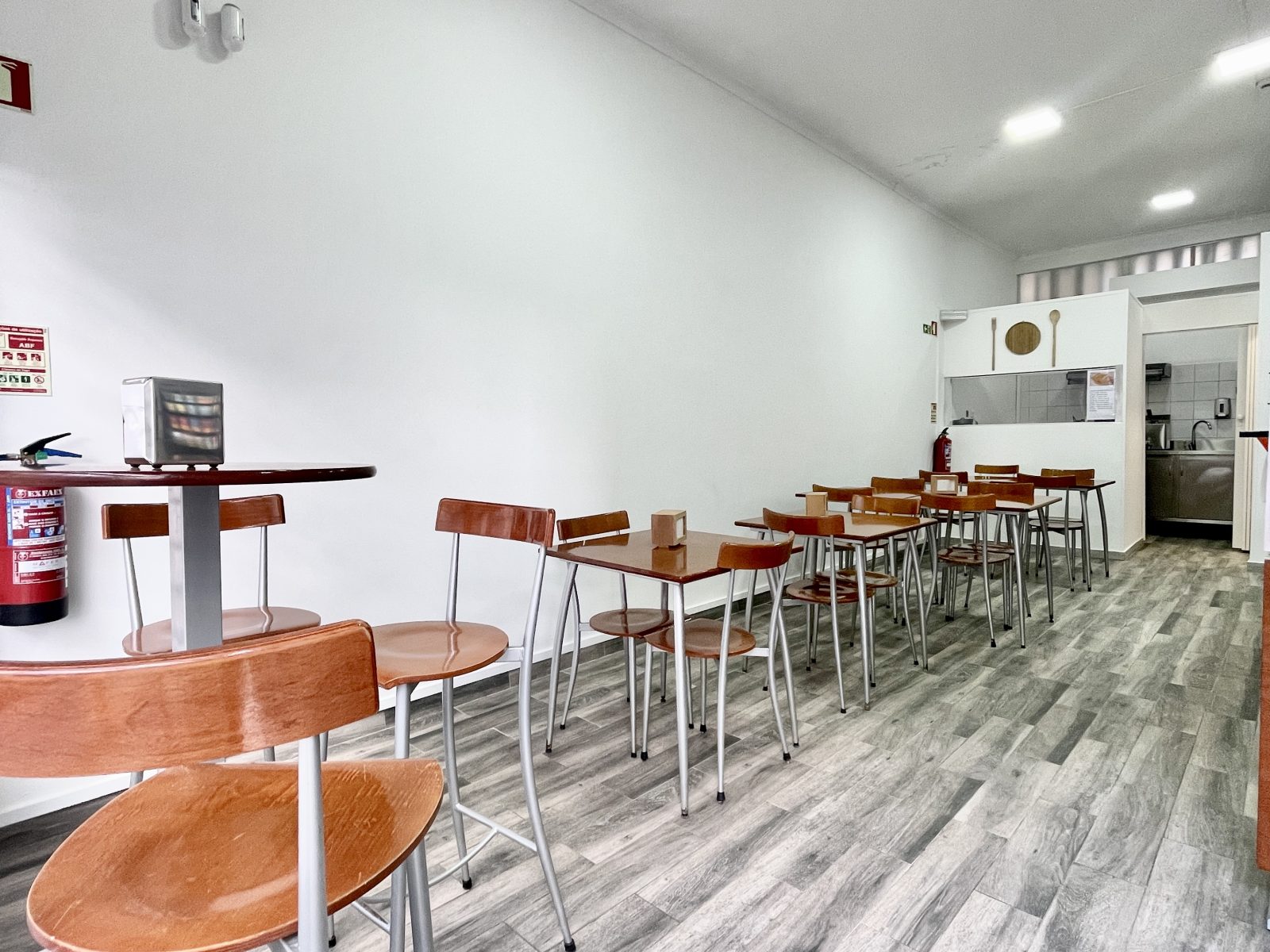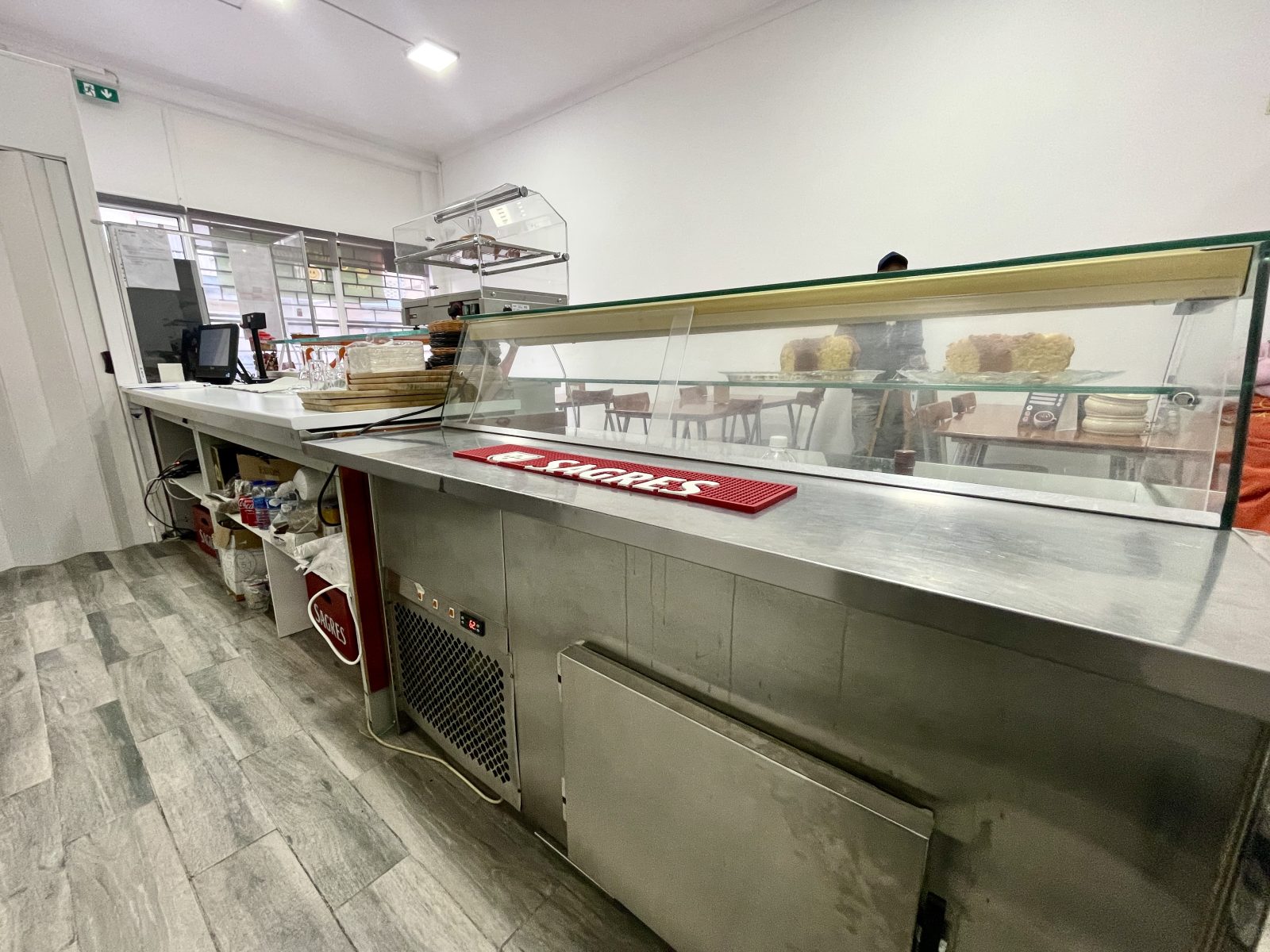 O espaço foi totalmente remodelado recentemente e fica todo equipado, com 2 máquinas de levedar massas, forno industrial e forno convencional, frigobar, frigorífico, vitrine de frigorífico, máquina de lavar loiça, exaustor, esquentador, computador, bancadas com lâminas de alumínio, 6 mesas, 14 cadeiras, 1 mesa bistrô com 3 banquetas e também uma máquina de fumos em consignação. Com câmera de segurança devidamente declaras em nome da empresa e regularizadas.